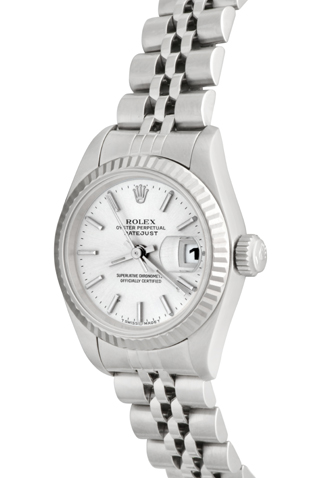Case Material: Stainless Steel case with 18k White Gold bezel (26 mm dia.)