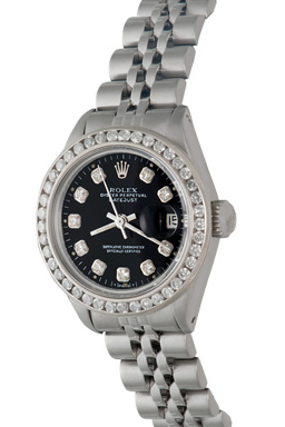 Case Material: Stainless Steel case with custom 14k White Gold 1.1 channel set Diamond bezel (26mm dia.)