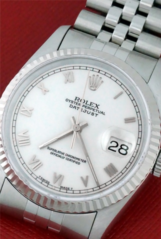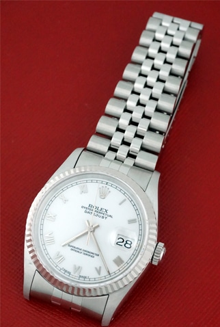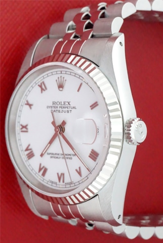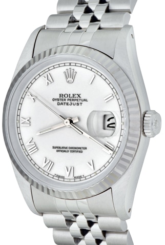 Case Material: Stainless Steel case with 18k White Gold fluted bezel (36mm dia.)
