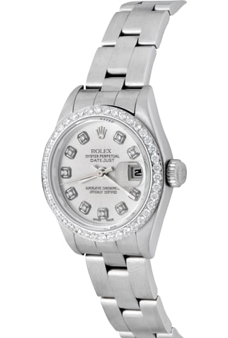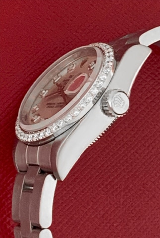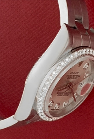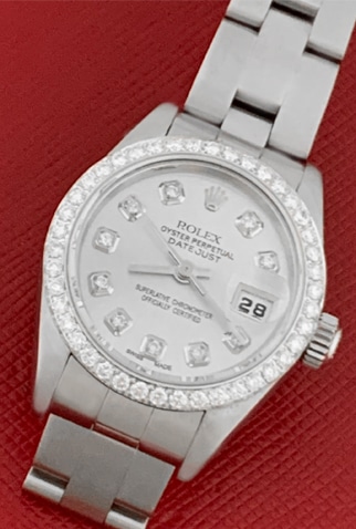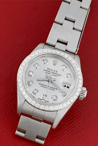 Case Material: Stainless Steel case with custom 18k White Gold Diamond bezel (26mm dia.)