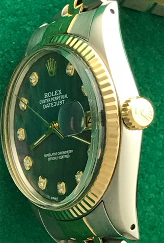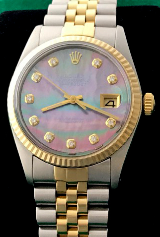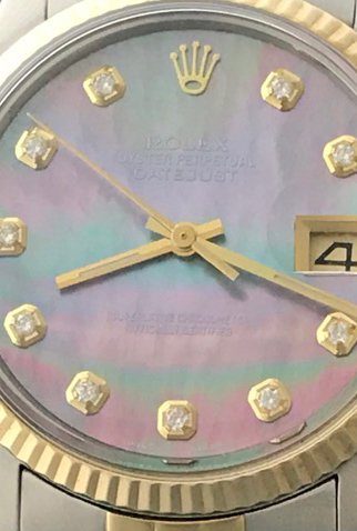 Dial: Custom dark Mother of Pearl Dial with Diamond hour markers