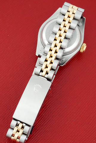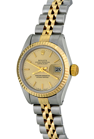 Case Material: Stainless Steel case with 18k Yellow Gold fluted bezel (26mm dia.)