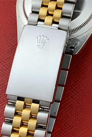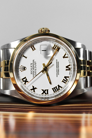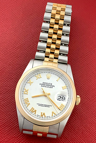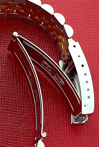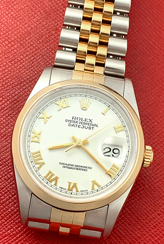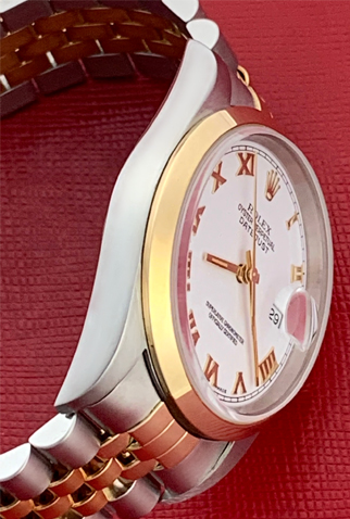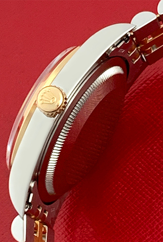 Case Material: Stainless Steel case with 18k Yellow Gold smooth bezel (36mm dia.)