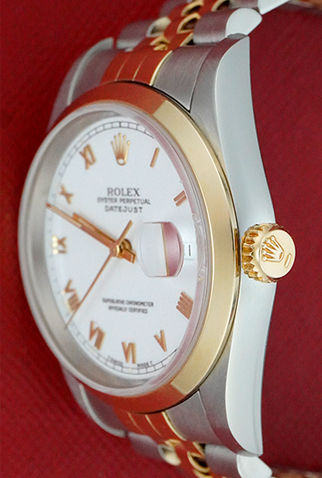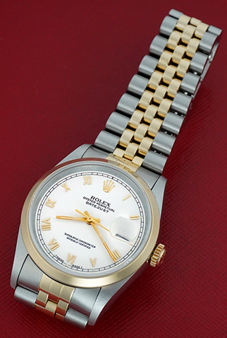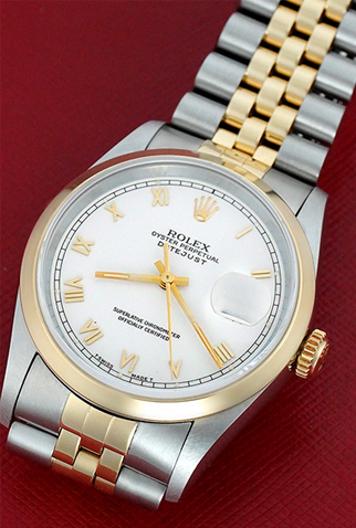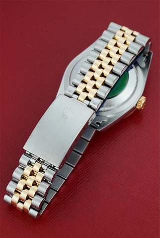 Case Material: Stainless Steel case with 18k Yellow Gold smooth bezel (36mm dia.)