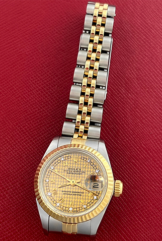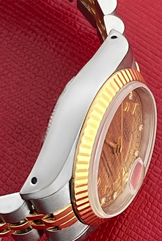 Dial: Rolex Champagne “Hound’s Tooth” Dial with gold Roman numerals and Diamond hour markers
