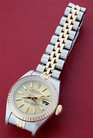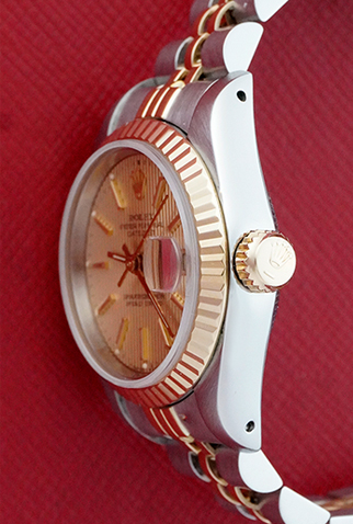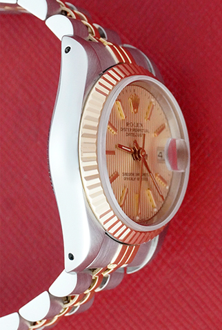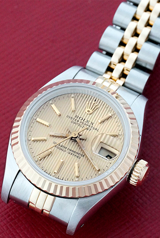Case Material: Stainless Steel case with 18k Yellow Gold fluted bezel (26mm dia.)