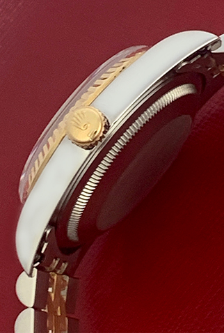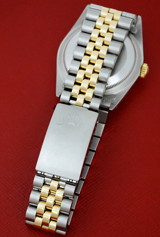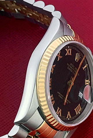 Case Material: Stainless Steel case with 18k Yellow Gold fluted bezel (36mm dia.)