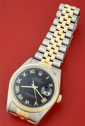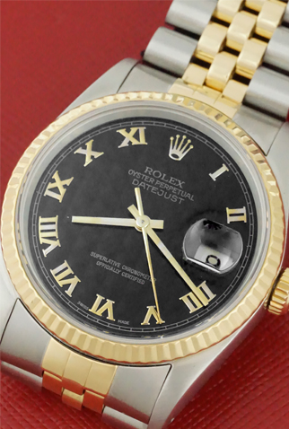 Dial: Black Pyramid Dial with Yellow Gold Roman numerals