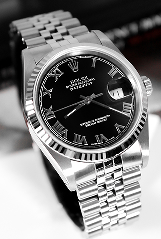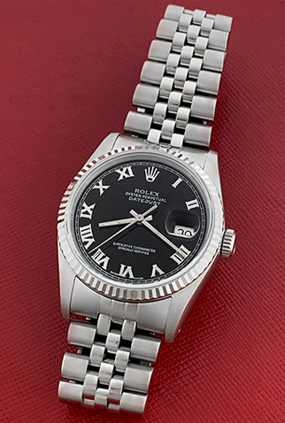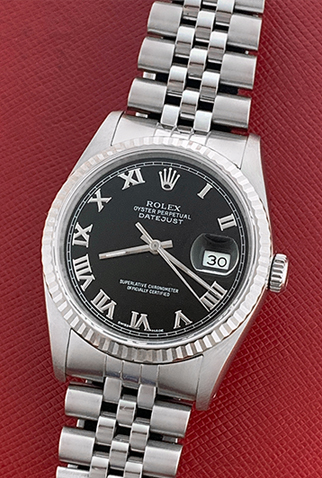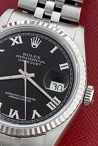 Case Material: Stainless Steel case with 18k White Gold fluted bezel (36mm dia.)