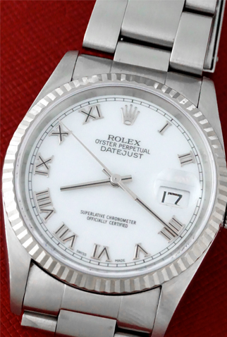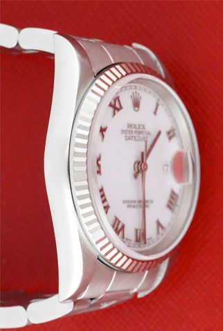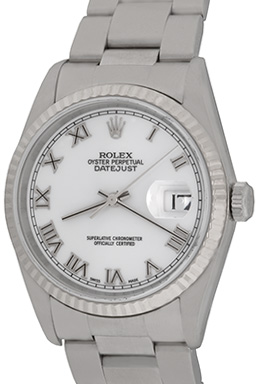Case Material: Stainless Steel case with 18k White Gold fluted bezel (36mm dia.)
