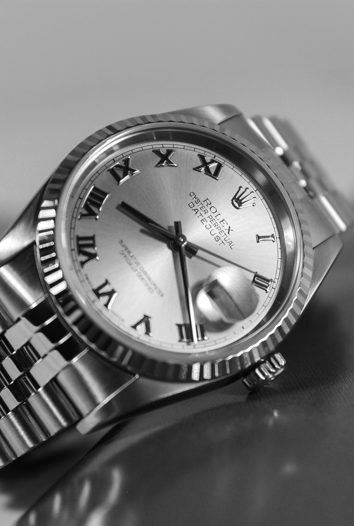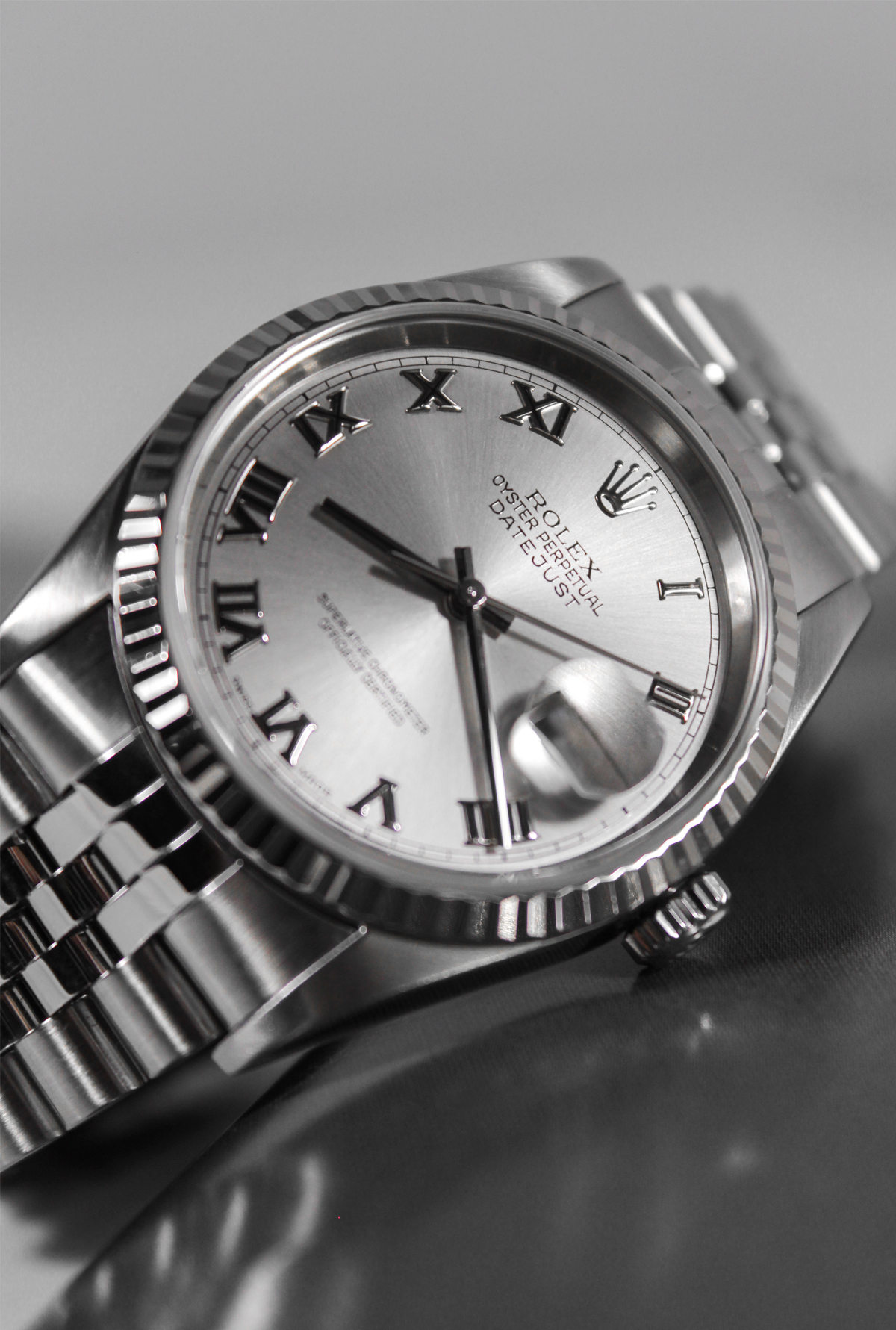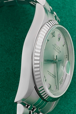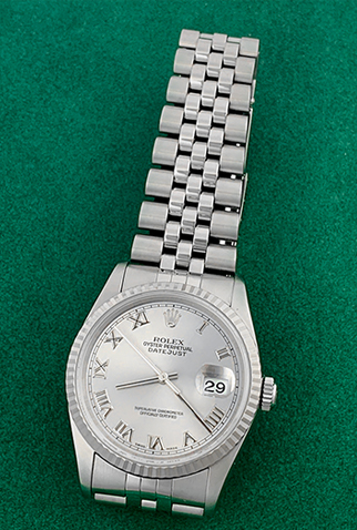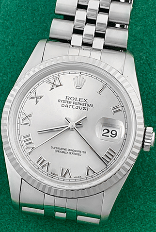 Case Material: Stainless Steel case with 18k White Gold fluted bezel (36mm dia.)