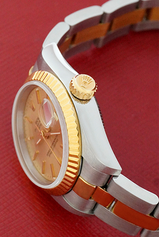 Case Material: Stainless Steel case with 18k Yellow Gold fluted bezel (26mm dia.)