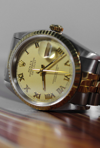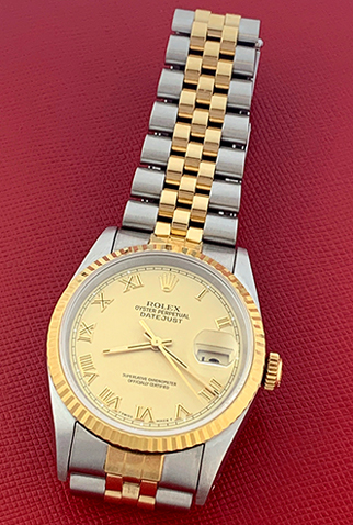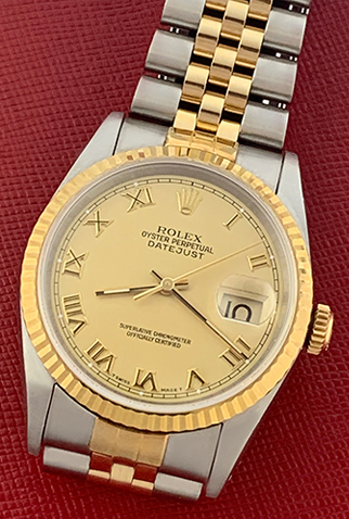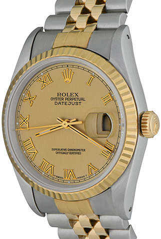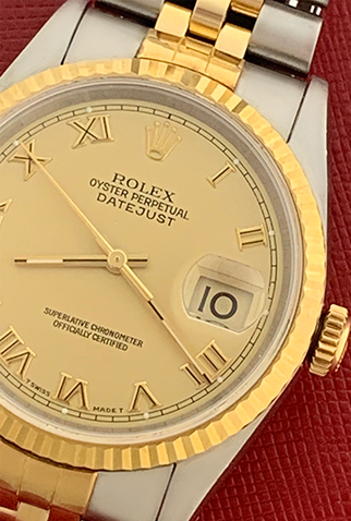 Case Material: Stainless Steel case with 18k Yellow Gold fluted bezel (36mm dia.)