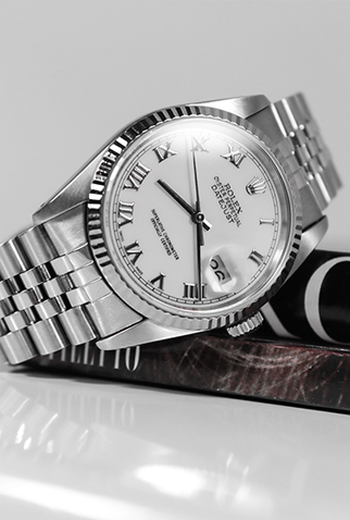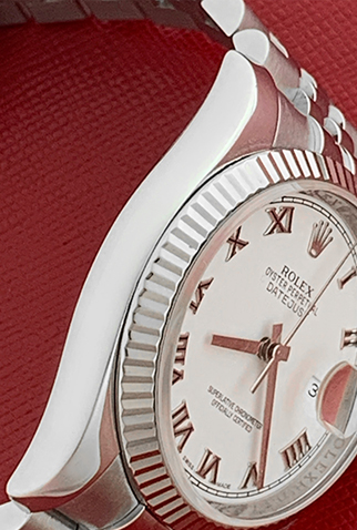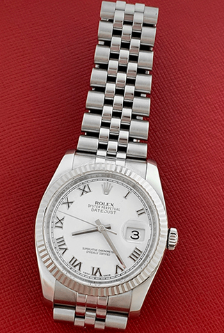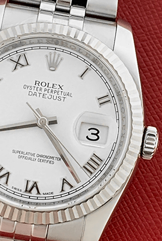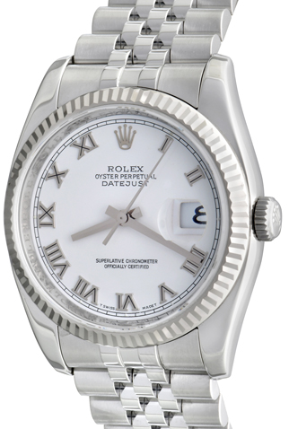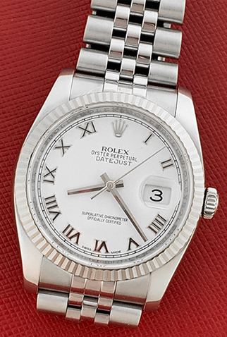 Case Material: Stainless Steel case with 18k White Gold fluted bezel (36mm dia.)