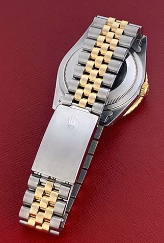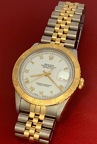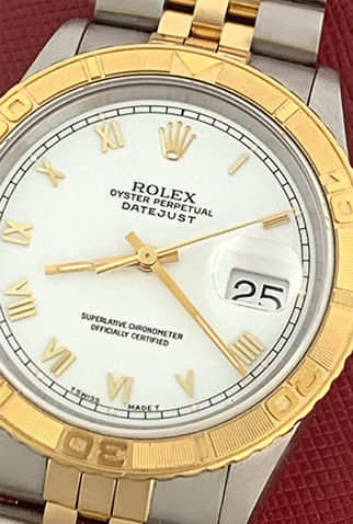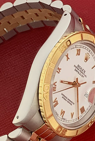 Case Material: Stainless Steel case with 18k Yellow Gold Thunderbird bezel (36mm dia.)