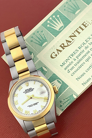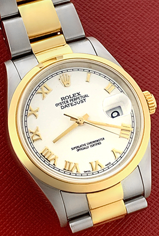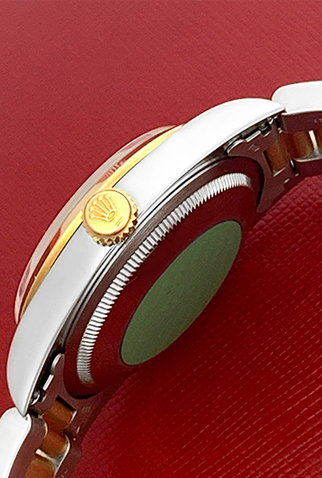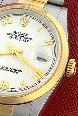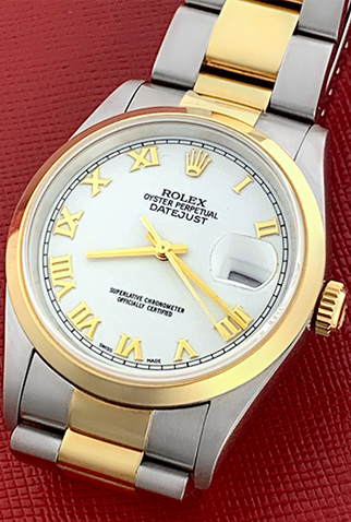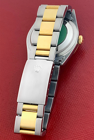 Case Material: Stainless Steel case with 18k Yellow Gold smooth bezel (36mm dia.)
