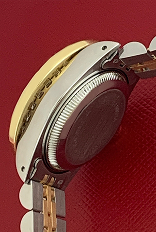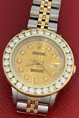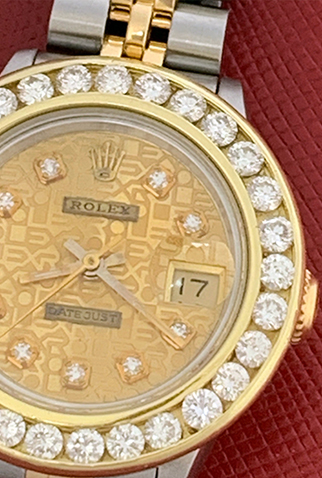 Case Material: Stainless Steel case with 18k Yellow Gold custom 2.15 ct. channel set Diamond bezel (26mm dia.)