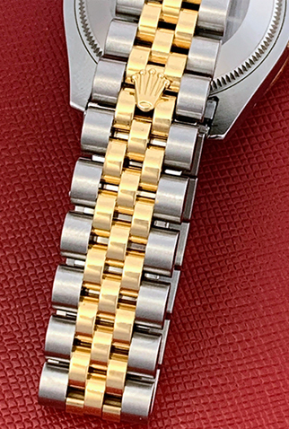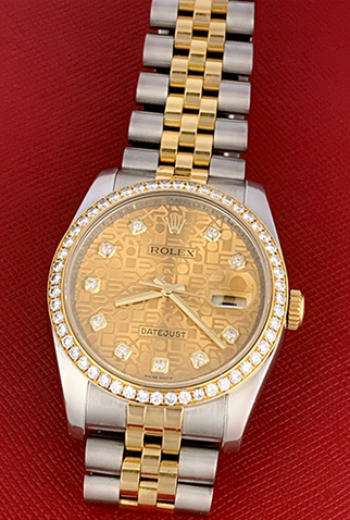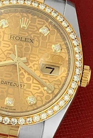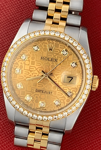 Case Material: Stainless Steel case with 18k Yellow Gold Rolex Diamond bezel (36mm dia.)