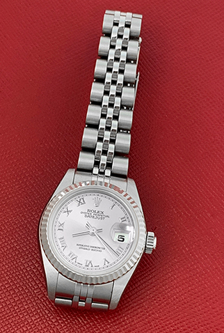 Case Material: Stainless Steel case with 18k White Gold fluted bezel (26mm dia.)