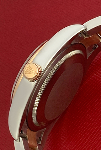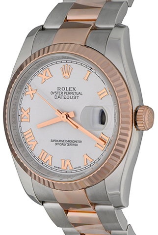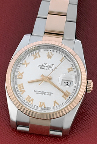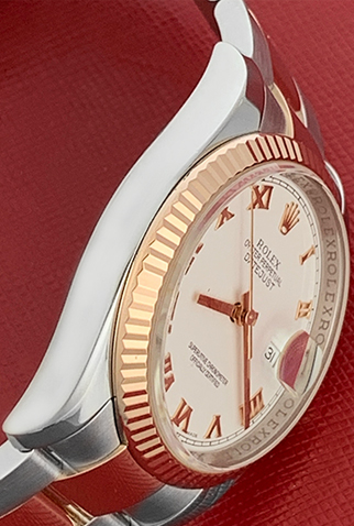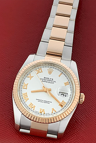 Case Material: Stainless Steel case with 18k Rose Gold fluted bezel (36mm dia.)