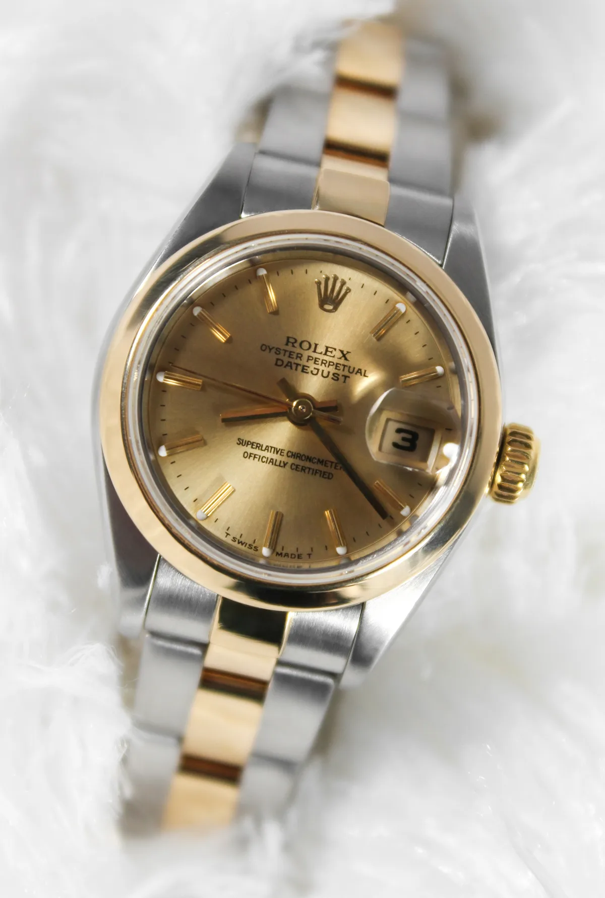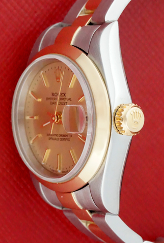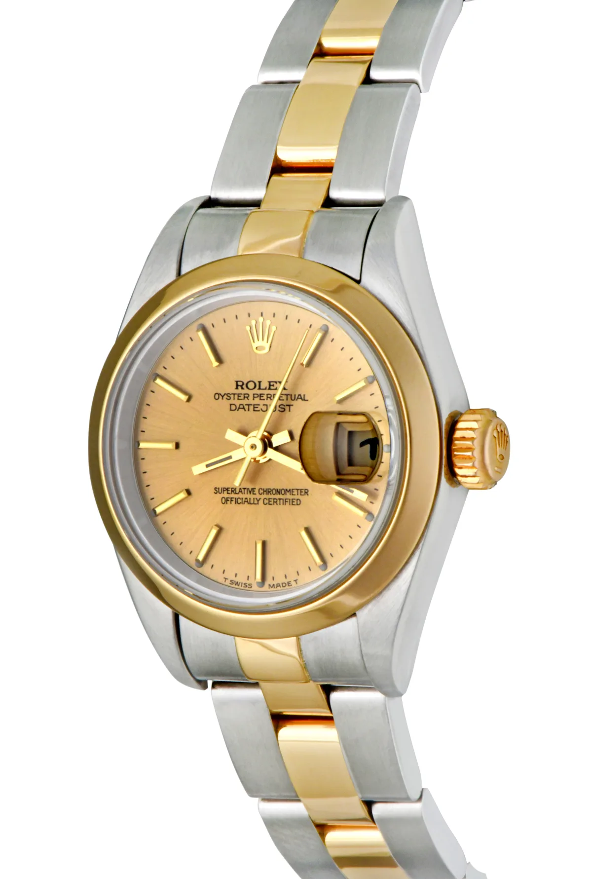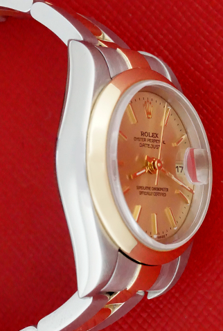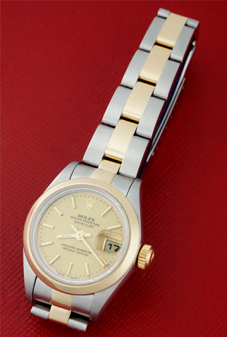 Case Material: Stainless Steel case with 18k Yellow Gold smooth bezel (26mm dia.)