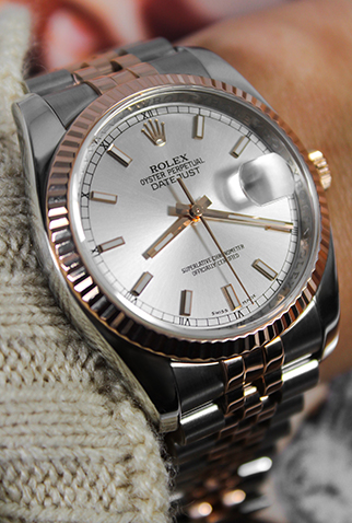 Case Material: Stainless Steel case with 18k Rose Gold fluted bezel (36mm dia.). Water Resistant to 100 Meters