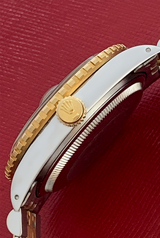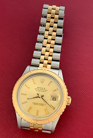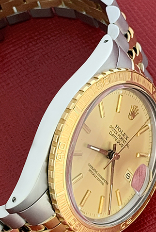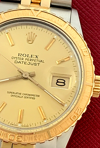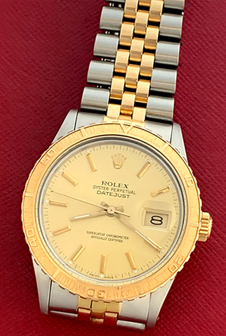 Case Material: Stainless Steel case with 18k Yellow Gold Thunderbird bezel (36mm dia.)