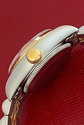 Case Material: Stainless Steel case with 18k Yellow Gold smooth bezel (26mm dia.)
