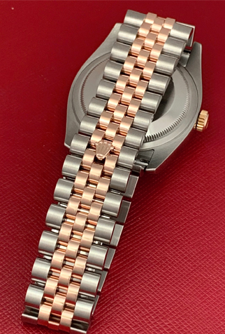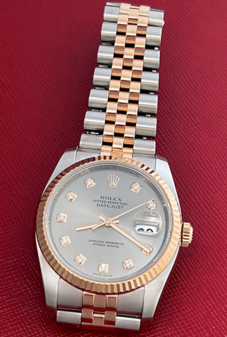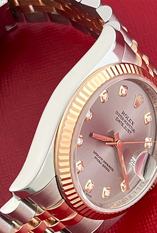 Case Material: Stainless Steel case with 18k Rose Gold fluted bezel (36mm dia.)