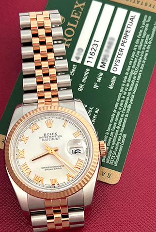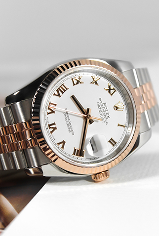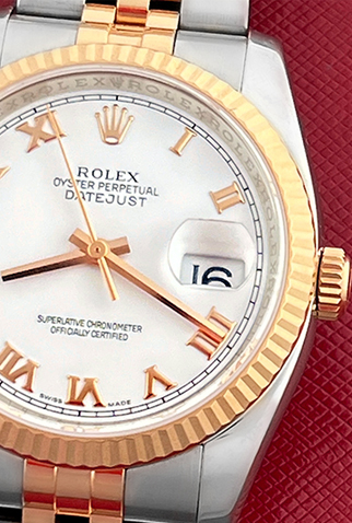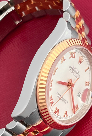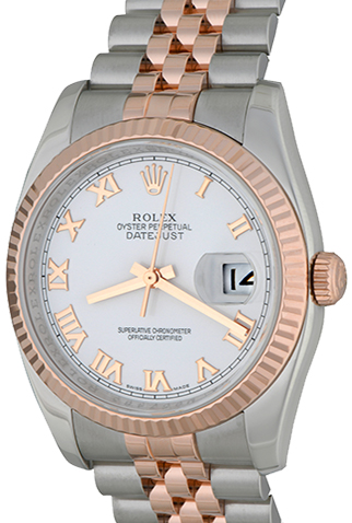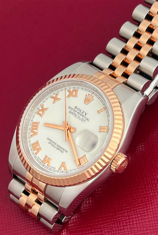 Case Material: Stainless Steel case with 18k Rose Gold fluted bezel (36mm dia.)