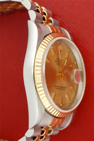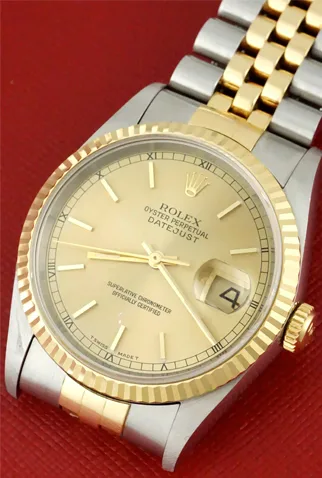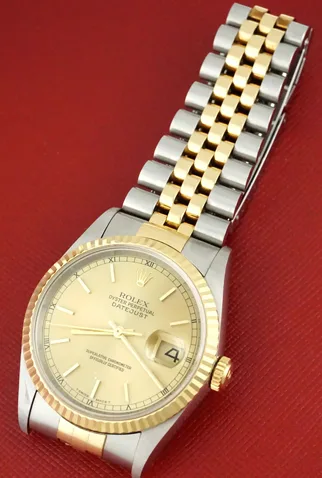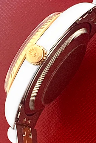 Case Material: Stainless Steel case with 18k Yellow Gold fluted bezel (36mm dia.)