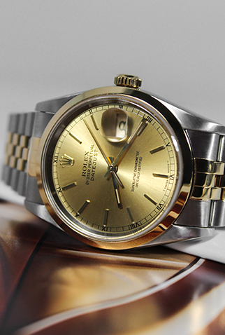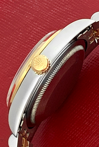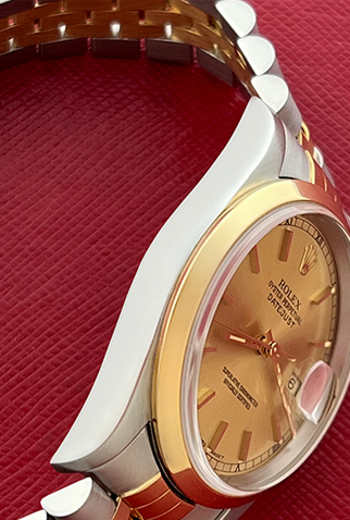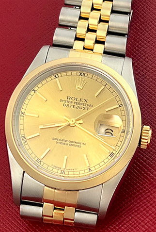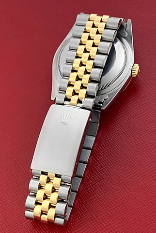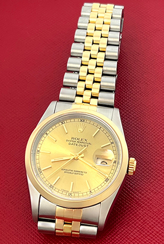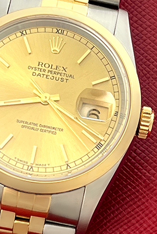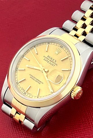 Case Material: Stainless Steel case with 18k Yellow Gold smooth bezel (36mm dia.)