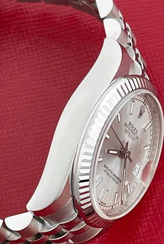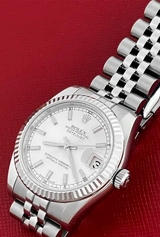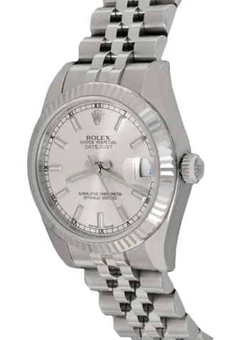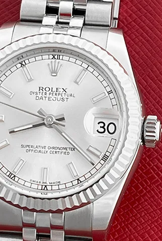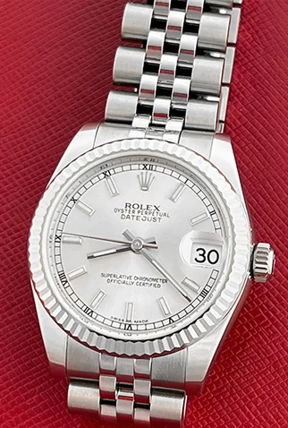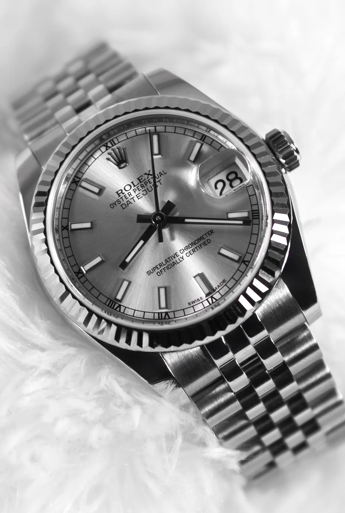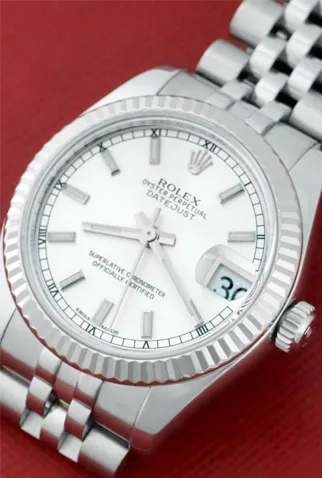 Case Material: Stainless Steel case with 18k White Gold fluted bezel (31mm dia.)