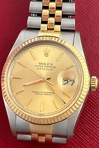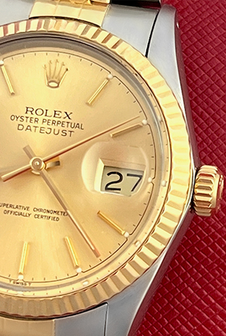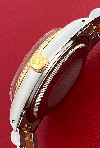 Case Material: Stainless Steel case with 18k Yellow Gold fluted bezel (36mm dia.)
