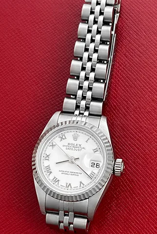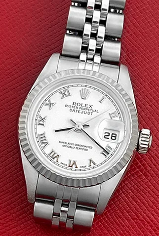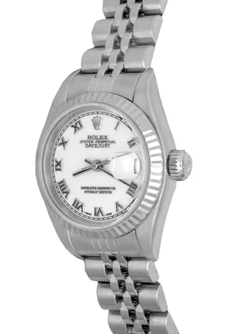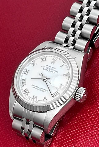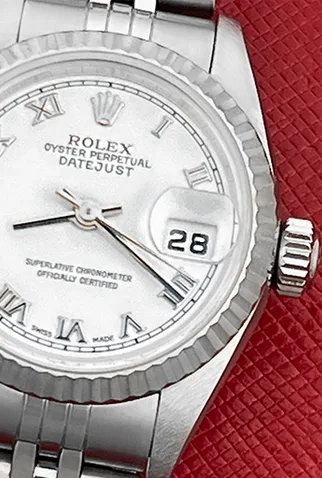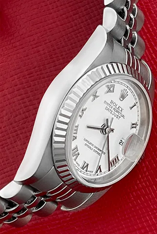 Case Material: Stainless Steel case with 18k White Gold fluted bezel (26mm dia.)