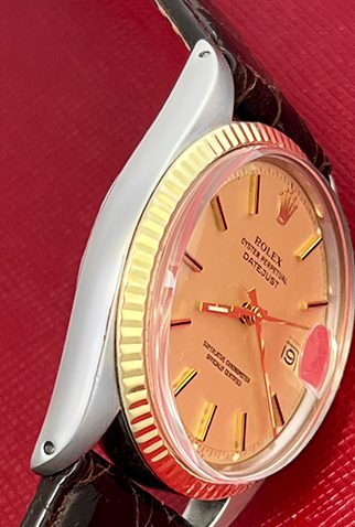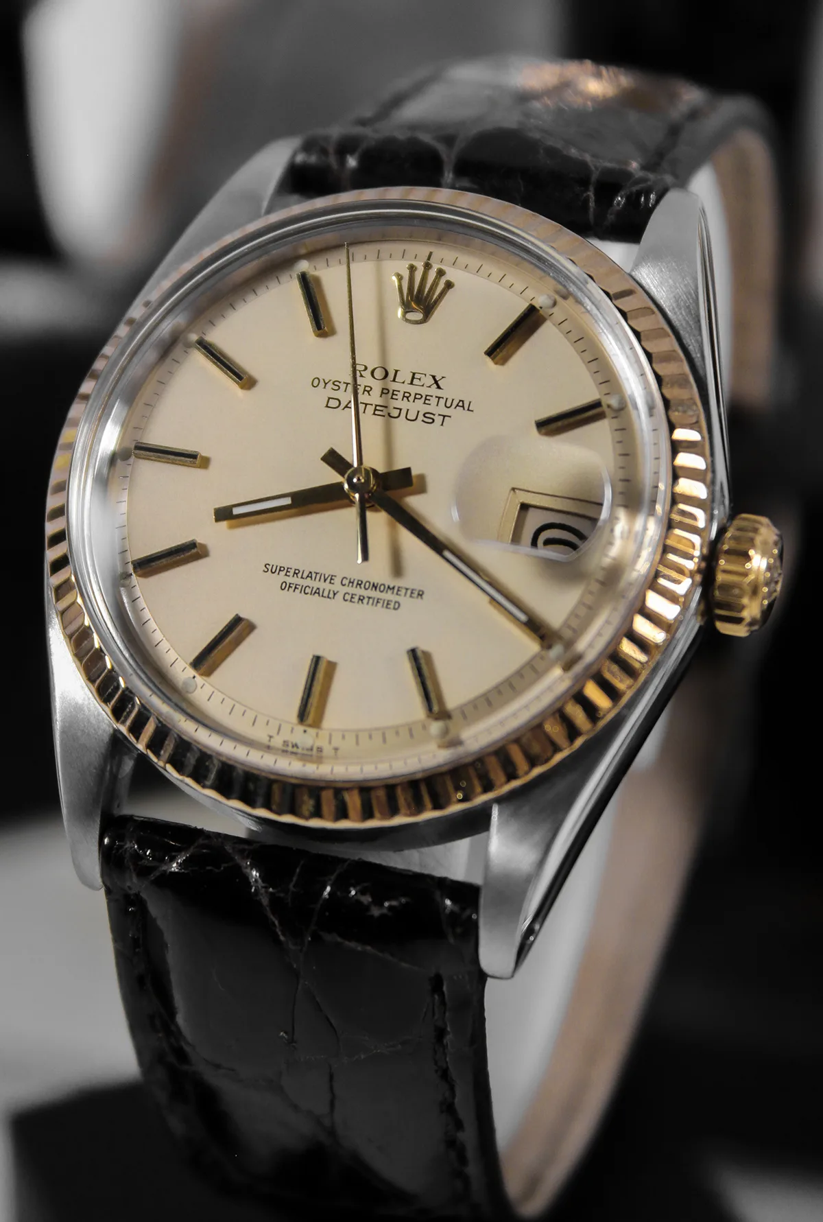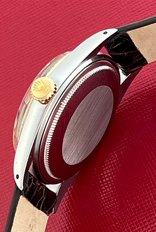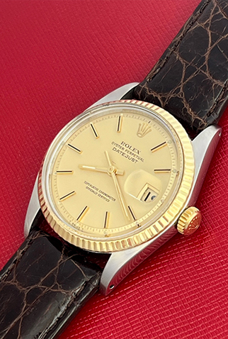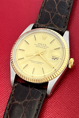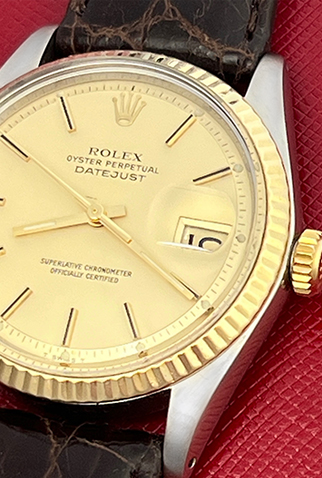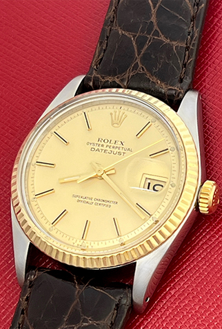 Case Material: Stainless Steel case with 14k Yellow Gold fluted bezel (36mm dia.)