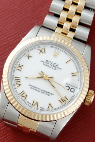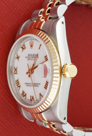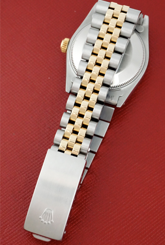 Case Material: Stainless Steel case with 18k Yellow Gold bezel (31mm dia.)