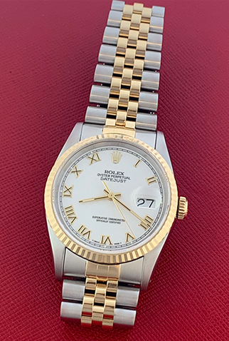 Case Material: Stainless Steel case with 18k Yellow Gold fluted bezel (36mm dia.)