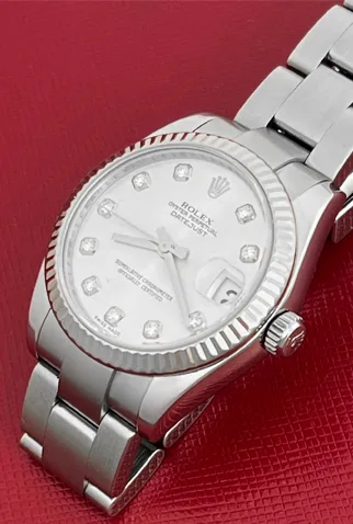Case Material: Stainless Steel case with 18k White Gold fluted bezel (31mm dia.)