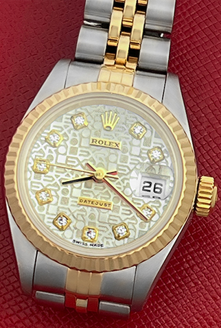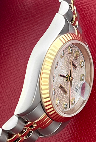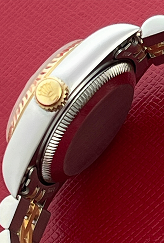 Case Material: Stainless Steel case with 18k Yellow Gold fluted bezel (26mm dia.)