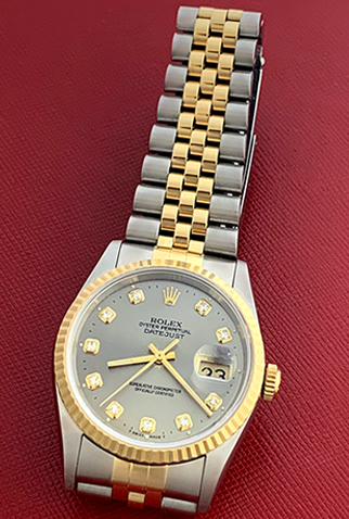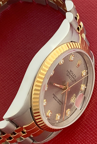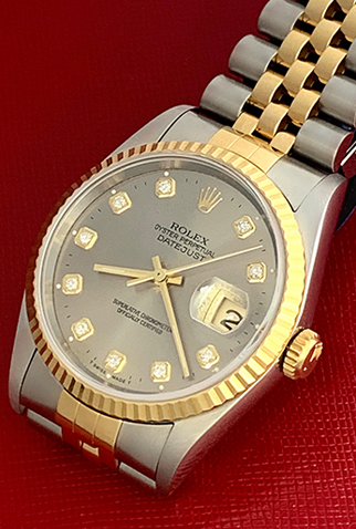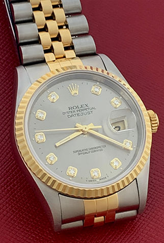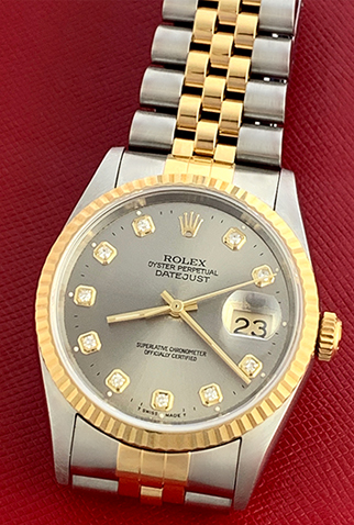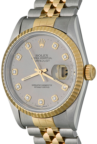 Case Material: Stainless Steel case with 18k Yellow Gold fluted bezel (36mm dia.)