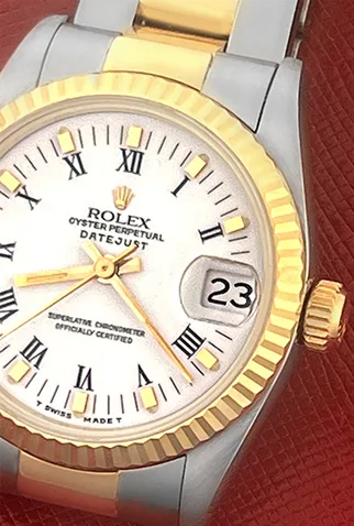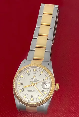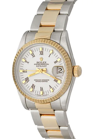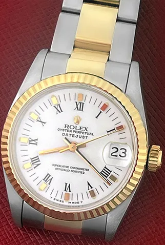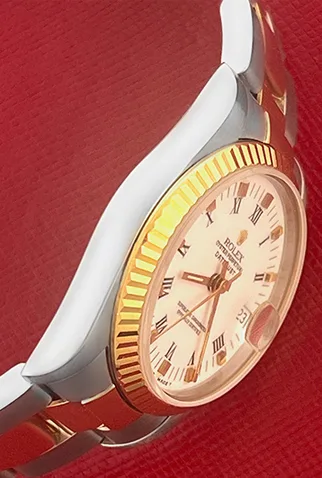 Case Material: Stainless Steel case with 18k Yellow Gold fluted bezel (31mm dia.)