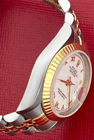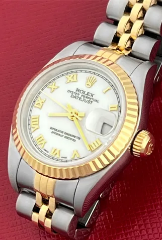 Case Material: Stainless Steel case with 18k Yellow Gold fluted bezel (26mm dia.)