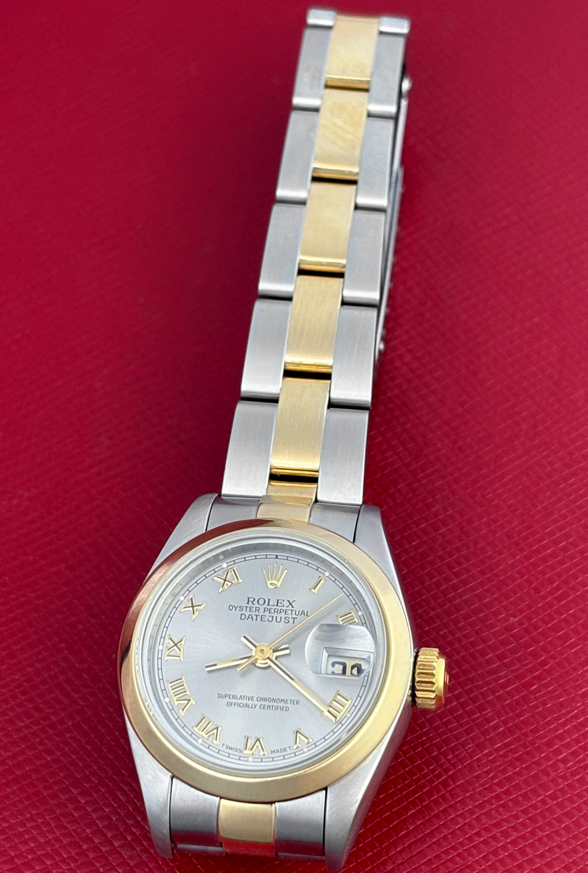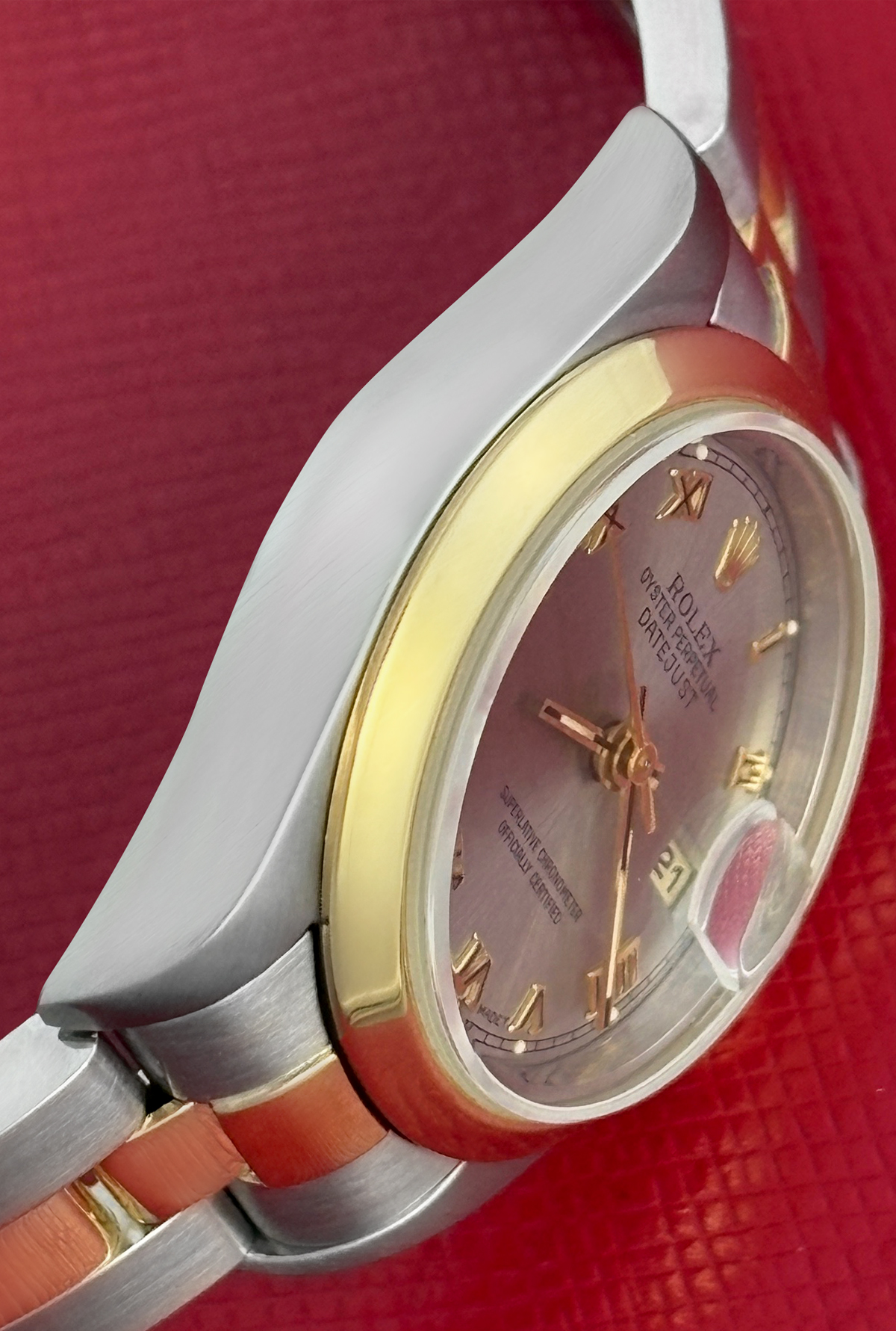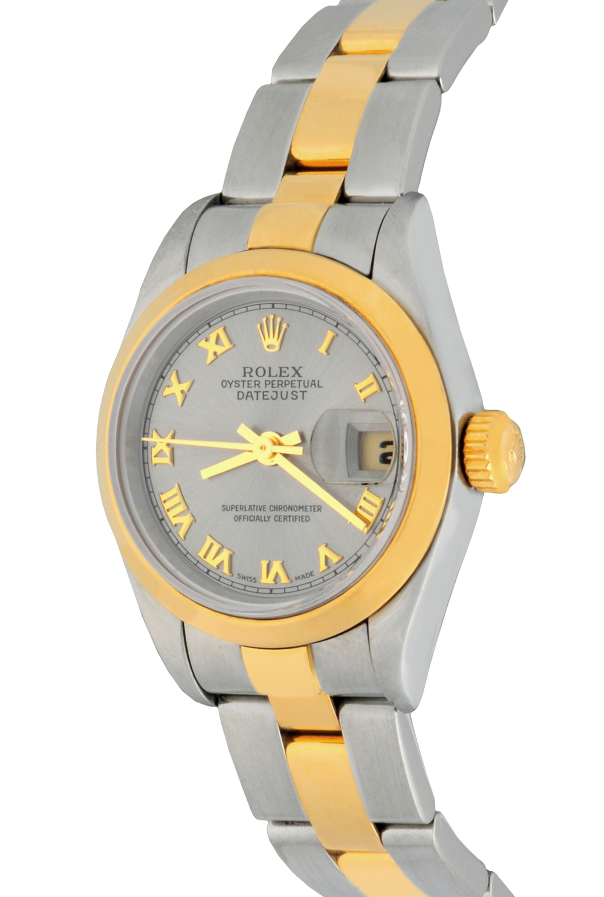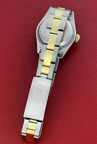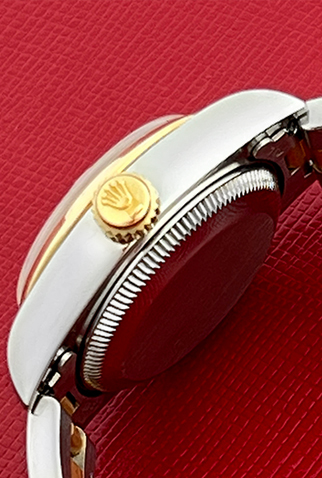 Case Material: Stainless Steel case with 18k Yellow Gold smooth bezel (26mm dia.)