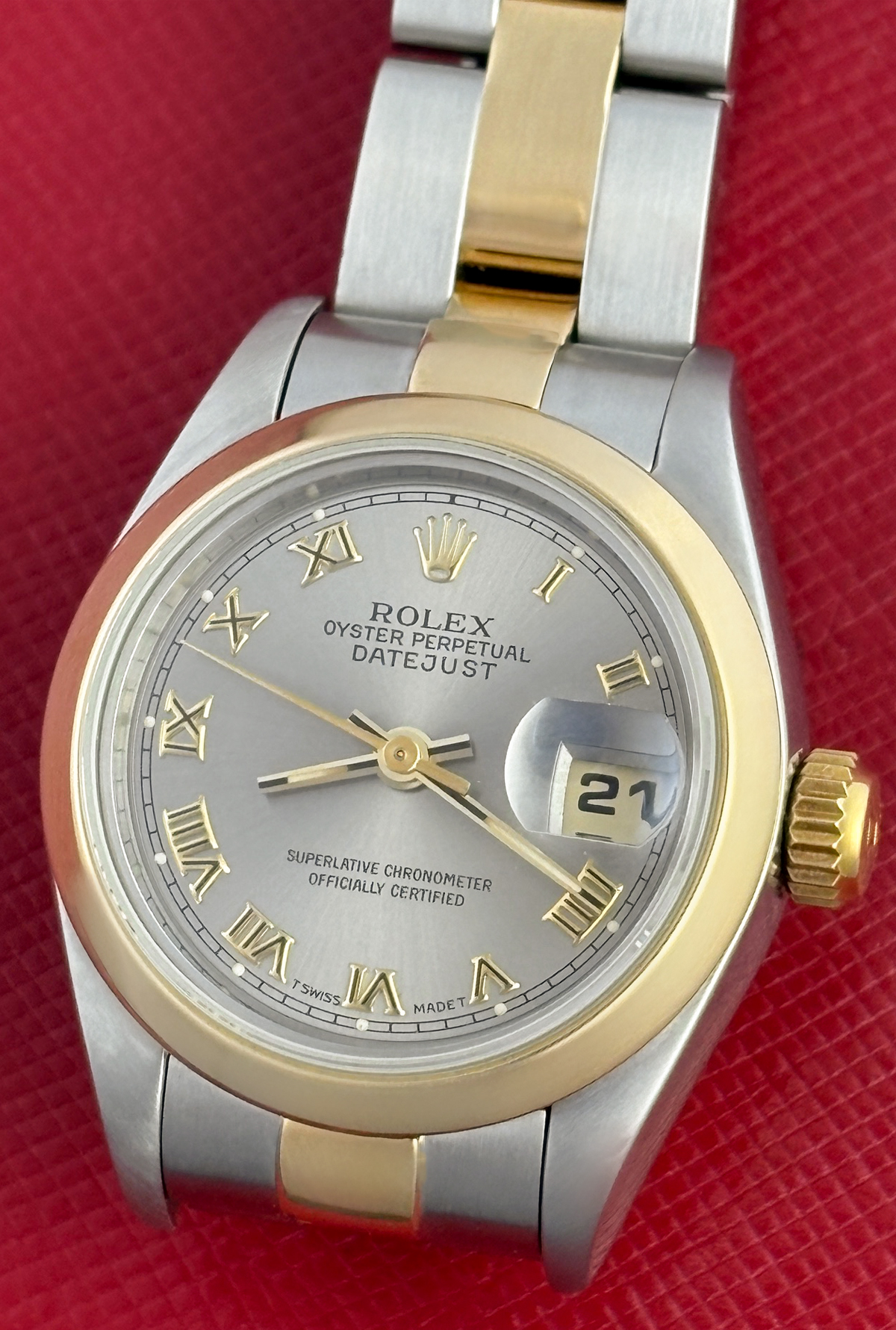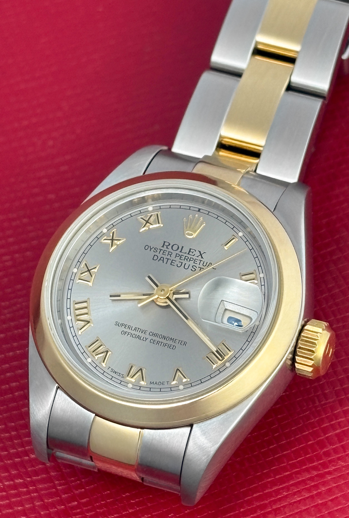 Dial: Slate Silver Dial with gold Roman numerals