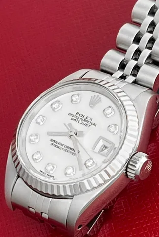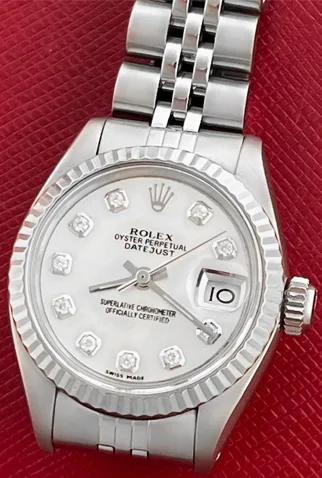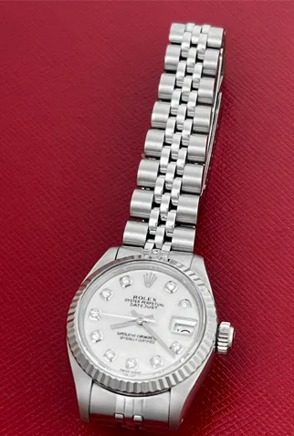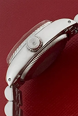 Case Material: Stainless Steel case with 14k White Gold fluted bezel (26mm dia.)
