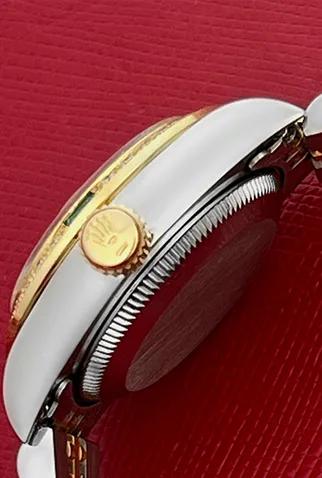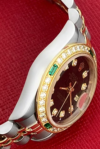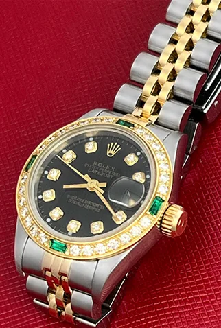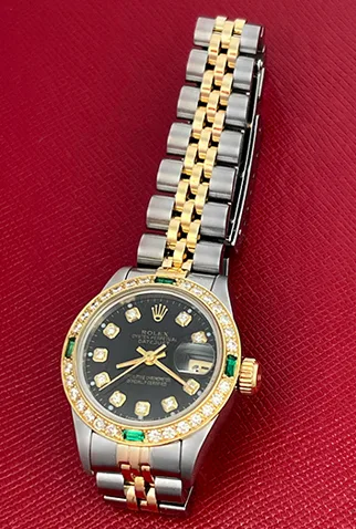 Case Material: Stainless Steel and 18k Yellow Gold case with custom diamond & emerald bezel (26mm dia.)