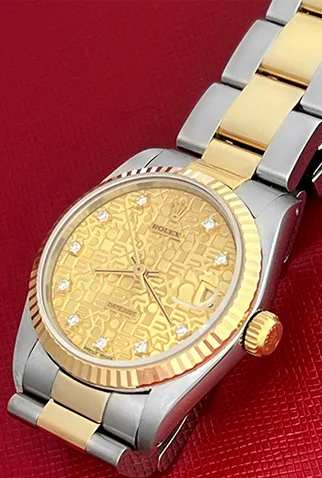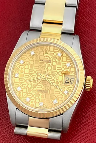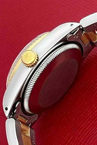 Case Material: Stainless Steel case with 18k Yellow Gold fluted bezel (31mm dia.)