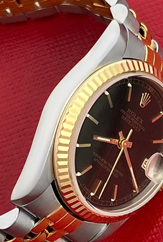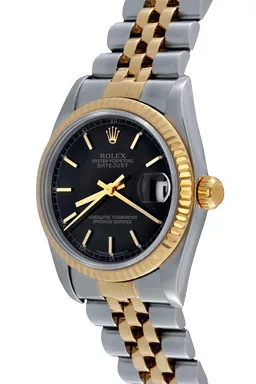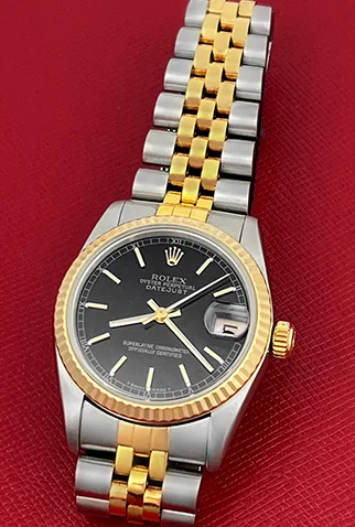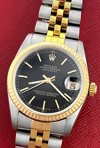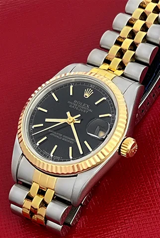 Case Material: Stainless Steel case with 18k Yellow Gold fluted bezel (31mm dia.)
