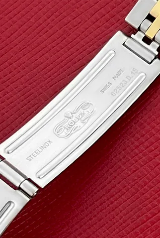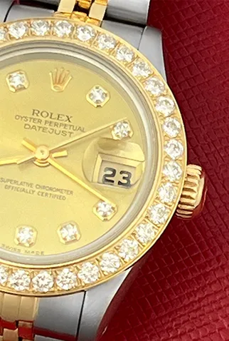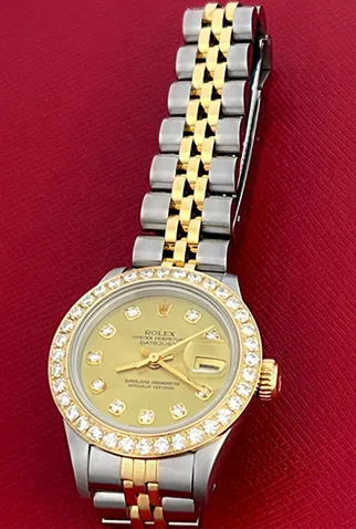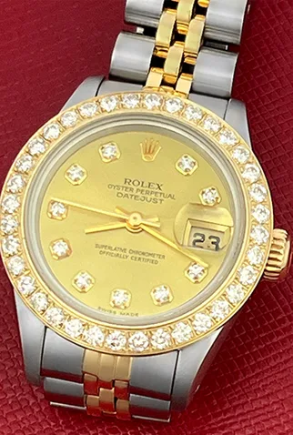 Case Material: Stainless Steel case with 18k Yellow Gold custom Diamond bezel (26mm dia.)